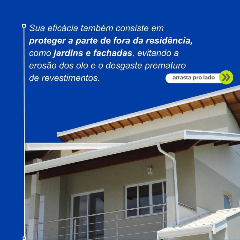 protegem o imóvel ao direcionar a água da chuva para longe da estrutura, prevenindo infiltrações, mofo, danos à alvenaria, erosão do solo e corrosão, garantindo maior durabilidade à edificação e um ambiente interno mais saudável.